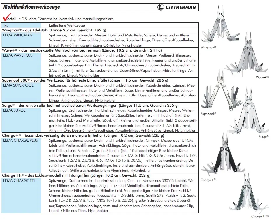 Die LEATHERMAN Multifunktionswerkzeuge – alle Typen sind hochwertige, multifunktionale Werkzeuge für Profis und Heimwerker. Sie kombinieren Zangen, Messer, Schraubendreher, Feilen und weitere praktische Tools in einem kompakten Gerät. Alle Typen bieten unterschiedliche Tool-Kombinationen, sodass für jede Anwendung das passende Werkzeug verfügbar ist. Ideal für Werkstatt, Outdoor, Heimwerker, Handwerk und Notfälle.