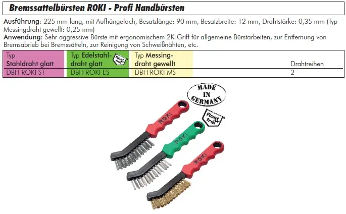 Die Lessmann Bremssattelbürsten ROKI – verschiedene Typen sind speziell für die gründliche und schonende Reinigung von Bremssätteln, Bremsanlagen und schwer zugänglichen Fahrzeugbauteilen entwickelt. Ihre kompakte, angepasste Bürstenform ermöglicht das effiziente Entfernen von Rost, Bremsstaub, Schmutz und Ablagerungen auch in engen Zwischenräumen. Sie sind ideal für den professionellen Einsatz in Kfz-Werkstätten, Servicebetrieben und der Fahrzeugwartung. Die Typenvielfalt bietet unterschiedliche Drahtmaterialien, Bürstenformen und Abmessungen für verschiedene Anwendungen.