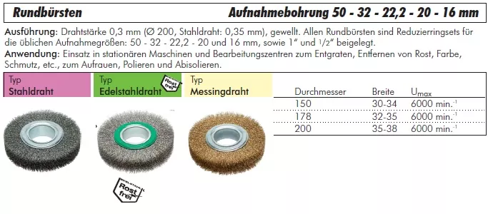 Drahtstärke 0,3 mm (Ø 200, Stahldraht: 0,35 mm), gewellt. Allen Rundbürsten sind Reduzierringsets für die üblichen Aufnahmegrößen: 50 - 32 - 22,2 - 20 und 16 mm, sowie 1" und 1/2" beigelegt.