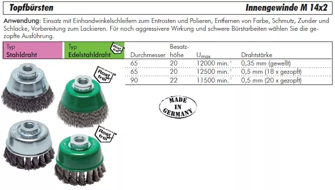 Einsatz mit Einhandwinkelschleifern zum Entrosten und Polieren, Entfernen von Farbe, Schmutz, Zunder und Schlacke, Vorbereitung zum Lackieren. Für noch aggressivere Wirkung und schwere Bürstarbeiten wählen Sie die gezopfte Ausführung.
