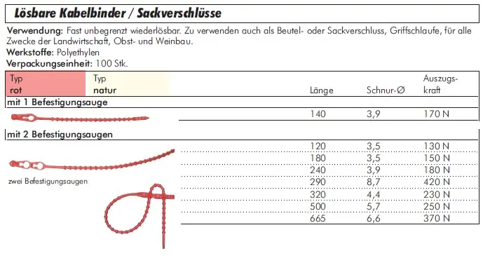 Verwendung: Fast unbegrenzt wiederlösbar. Zu verwenden auch als Beutel- oder Sackverschluß, Griffschlaufe, für alle Zwecke der Landwirtschaft, Obst- und Weinbau.