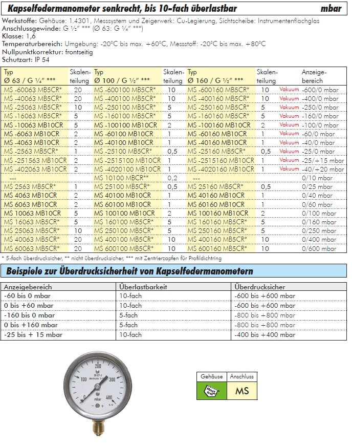 10-fache Überlastsicherheit: Einzigartiges Sicherheitsmerkmal, das eine Beschädigung des Messwerks bei versehentlichen Druckstößen bis zum 10-fachen des Endwertes verhindert.