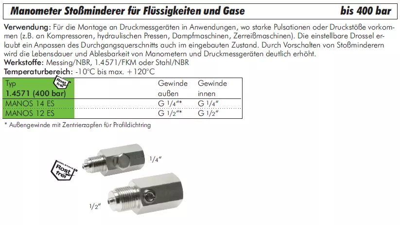 Manometer Stoßminderer für Flüssigkeiten und Gase, bis 400 bar, Edelstahl