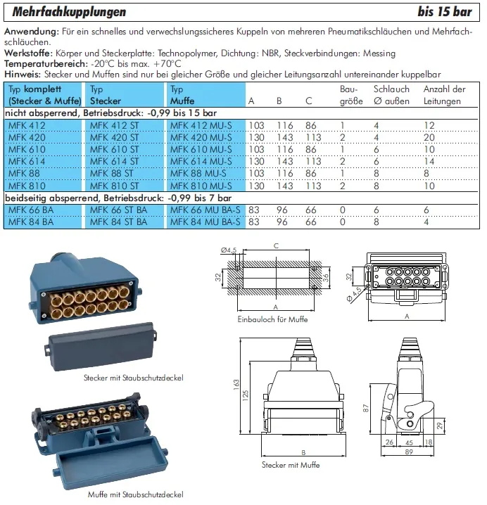 Anwendung: Für ein schnelles und verwechslungssicheres Kuppeln von mehreren Pneumatikschläuchen und Mehrfachschläuchen.