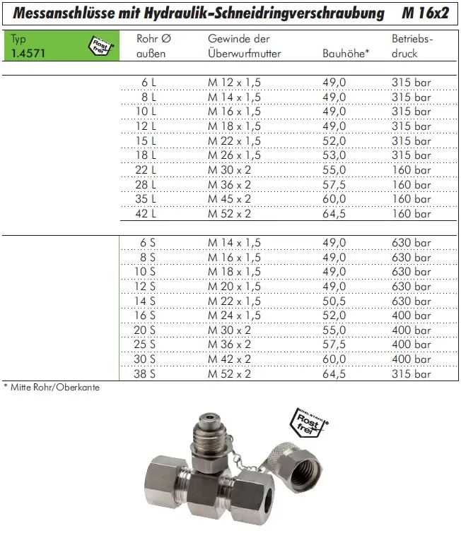 Schaffen Sie dauerhafte und hochresistente Diagnosepunkte in Ihren Edelstahl-Rohrleitungen. Unsere Messanschlüsse aus säurebeständigem Edelstahl 1.4571 ermöglichen die direkte Montage einer Diagnoseschnittstelle auf das Rohr. Ausgestattet mit einer vollständigen Schneidringverschraubung nach DIN 2353 / ISO 8434-1, bietet dieses Bauteil eine formschlüssige und absolut dichte Verbindung. Die integrierte M 16x2 Schraubkupplung erlaubt die Druckprüfung unter vollem Systemdruck – ideal für anspruchsvolle Wartungsintervalle in korrosiven Umgebungen.