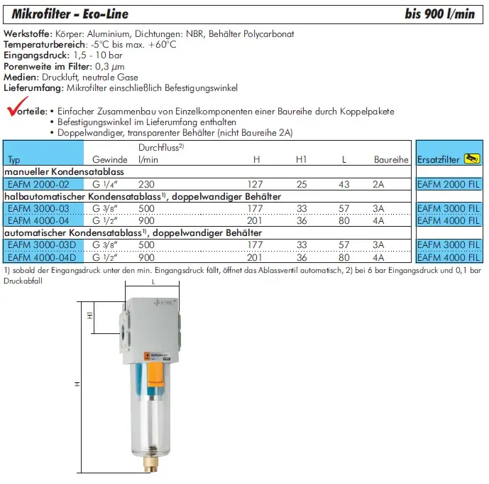 Das kompakte Design der Eco-Line verfügt über einen stabilen Behälter und ein hocheffizientes Filterelement, das für die Feinfiltration unerlässlich ist. Dies schützt teure, nachgeschaltete Präzisionskomponenten wie Messgeräte, Lackierpistolen oder medizinische Geräte effektiv vor Schäden. Für eine schnelle und unkomplizierte Montage liefern wir jeden Mikrofilter inklusive eines passenden Befestigungswinkels.