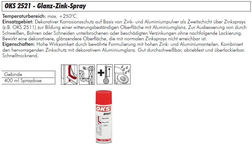 Die 400ml Spraydose ermöglicht eine einfache, gezielte und mobile Anwendung auf geschweißten Verbindungen, Schnittkanten, Bohrlöchern oder beschädigten verzinkten Flächen. OKS® 2521 ist temperaturbeständig, elektrisch leitfähig und bietet eine helle, hochglänzende Oberfläche.