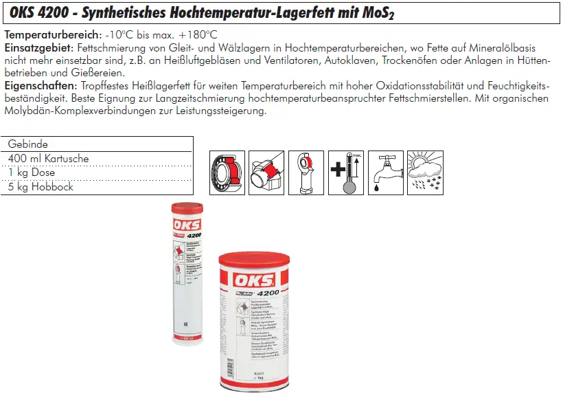 Startseite » Industriebedarf » OKS® Spezialfette & Schmierfette » OKS 4200 - Synthetisches Hochtemperatur-Lagerfett mit MoS2, verschiedene Gebinde