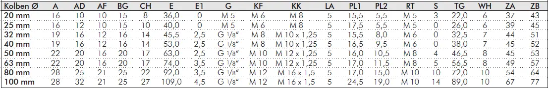 Kopf und Fuß: Aluminium, Zylinderrohr: Aluminium eloxiert, Kolbenstange: Edelstahl (Ø 32 - 100: Stahl hartverchromt), Dichtung: NBR / PUR