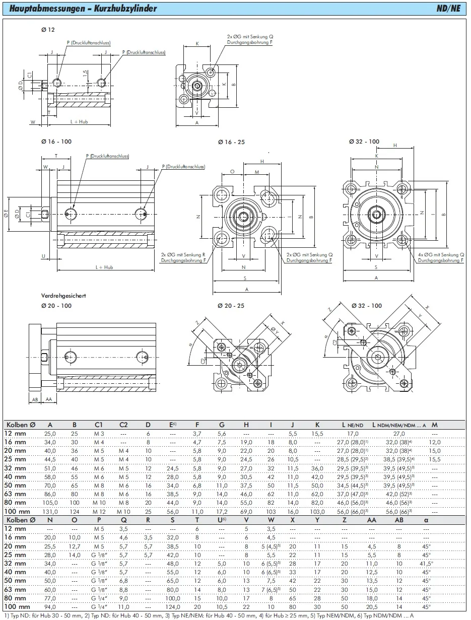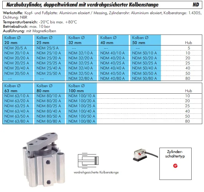 Pneumatik-Kurzhubzylinder doppeltwirkend mit verdrehgesicherter Kolbenstange, ND-Serie, alle Größen