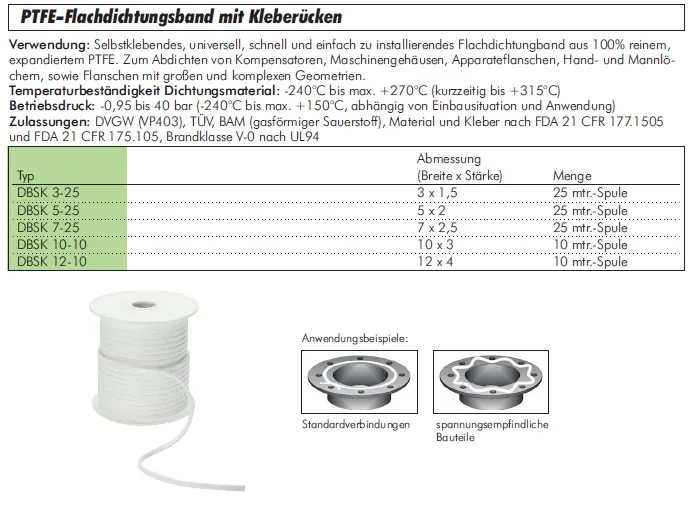 Selbstklebendes, universell, schnell und einfach zu installierendes Flachdichtungsband aus 100% reinem, expandiertem PTFE. Zum Abdichten von Kompensatoren, Maschinengehäusen, Apparateflanschen, Hand- und Mannlöchern, sowie Flanschen mit großem und komplexen Geometrien.