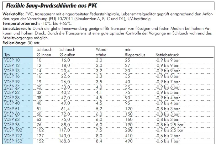 Durch die glatte Innenwandung geeignet für Transport von flüssigen und festen Medien bei hohem Vakuum und hohem Druck. Durch die Transparenz ist eine gute optische Kontrolle der Vorgänge im Schlauch während des Arbeitsvorganges möglich.