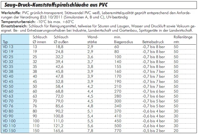 Schlauch für Reinigungsmittel, teilweise für Säuren und Laugen, Wasser und Druckluft sowie Vakuum geeignet. Be- und Entwässerungsvorhaben bei Industrie, Landwirtschaft und Gartenbau, Spritzgeräte in der Landwirtschaft.