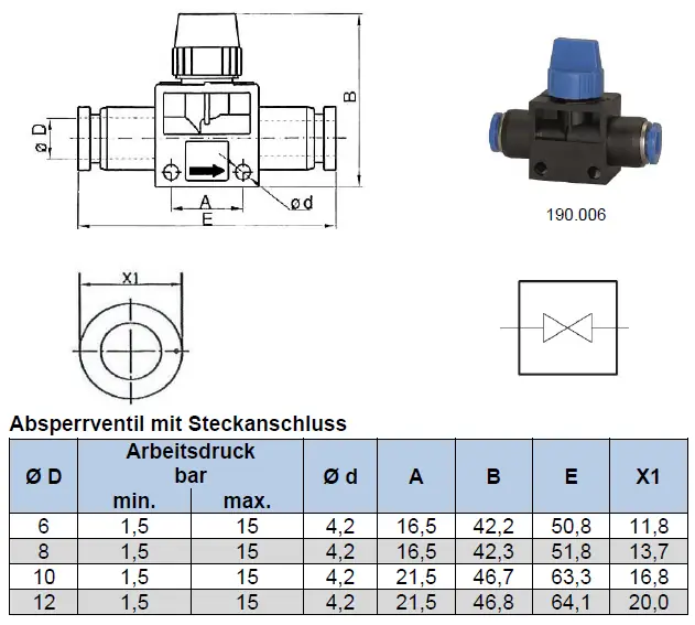 Der praktische Steckanschluss erlaubt den direkten Anschluss von Pneumatikschläuchen ohne zusätzliche Adapter. Der integrierte Absperrmechanismus sorgt für ein sicheres Schließen und eine zuverlässige Steuerung des Luftstroms.