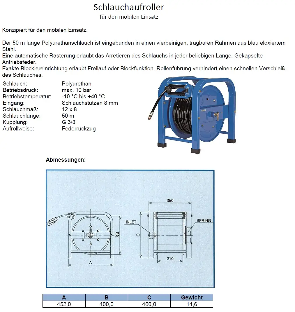 Riegler Schlauchaufroller mit 50 m Polyurethanschlauch 12x8 mm für mobilen Einsatz. Robust, flexibel und handlich – ideal für Werkstatt, Industrie und mobile Druckluftarbeiten.