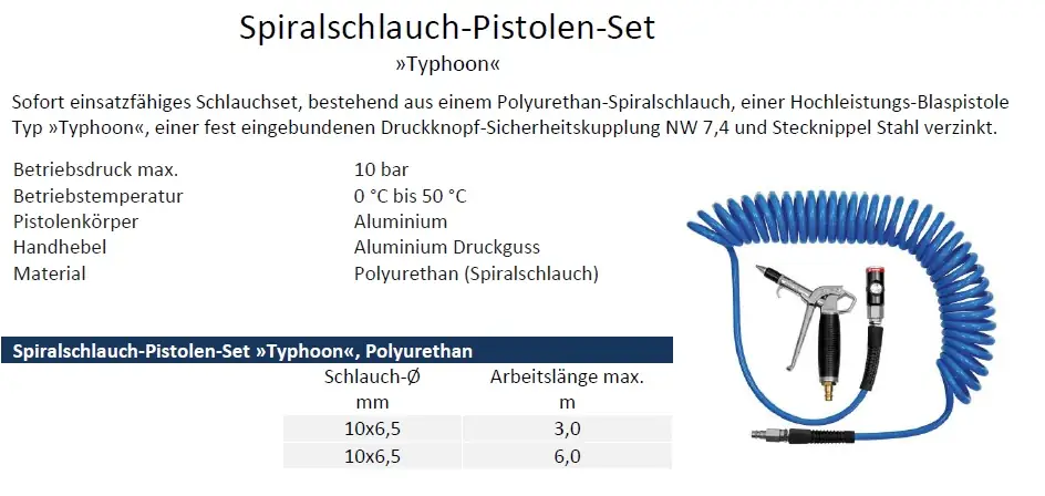 Sofort einsatzfähiges Schlauchset, bestehend aus einem Polyurethan-Spiralschlauch, einer Hochleistungs-Blaspistole Typ »Typhoon«, einer fest eingebundenen Druckknopf-Sicherheitskupplung NW 7,4 und Stecknippel Stahl verzinkt.