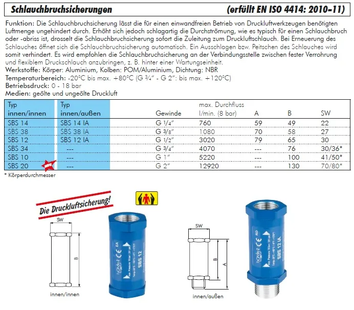 Zertifizierte Schlauchbruchsicherung (SBS) nach EN ISO 4414 für sichere Druckluftsysteme