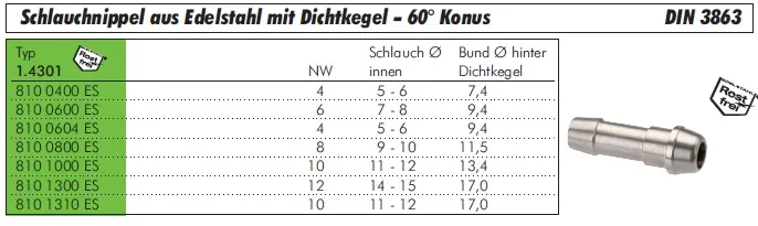 Schlauchnippel aus Edelstahl mit Dichtkegel - 60° Konus, DIN 3863