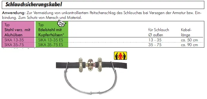 Anwendung: Zur Vermeidung von unkontrolliertem Peitschenschlag des Schlauches bei Versagen der Armatur bzw. Einbindung. Zum Schutz von Mensch und Material.