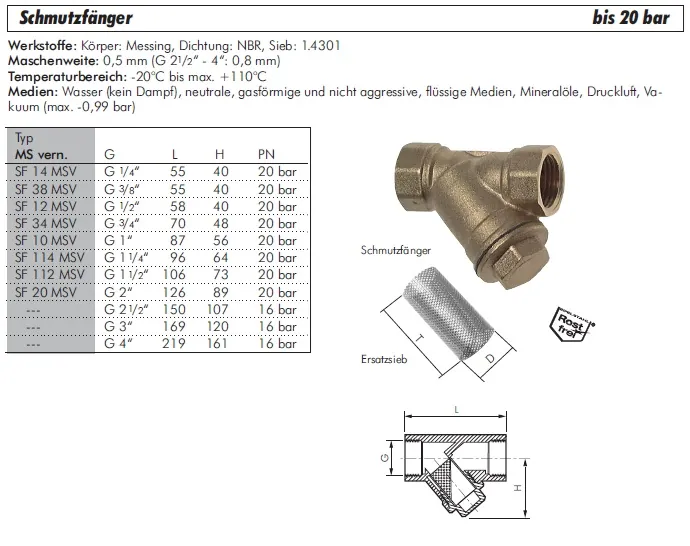 Werkstoffe:Körper: Messing vernickelt, Dichtung: NBR, Sieb: 1.4301