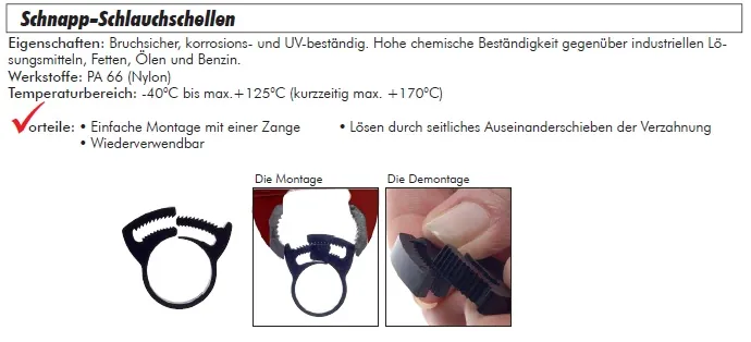 Ideal für sichere Schlauchbefestigung in Industrieanlagen, Maschinenbau, Werkstätten, Pneumatik- und Hydrauliksystemen. Schützt Schläuche vor Verrutschen und Beschädigungen.