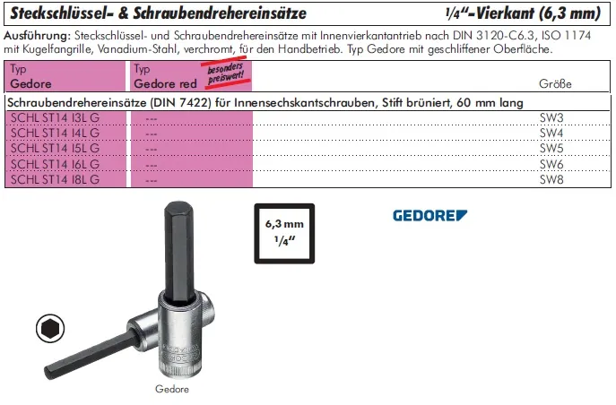 Ausführung: Steckschlüssel- und Schraubendrehereinsätze mit Innenvierkantantrieb nach DIN 3120-C6.3, ISO 1174 mit Kugelfangrille, 1/4"-Vierkant (6,3 mm), 60mm lang, Vanadium-Stahl, verchromt, für den Hanbetrieb. Typ Gedore mit geschliffener Oberfläche.