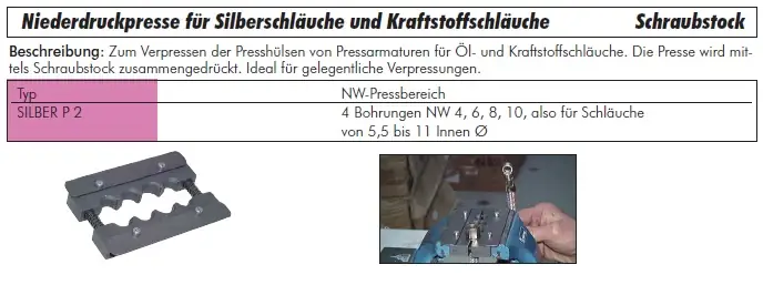 Zum Verpressen der Presshülsen von Pressarmaturen für Öl- und Kraftstoffschläuche. Die Presse wird mittels Schraubstock zusammengedrückt. Ideal für gelegentliche Verpressungen.