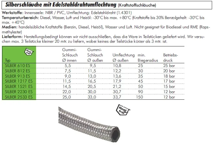 Unser Silberschlauch mit Edelstahldrahtumflechtung ist als Meterware erhältlich und bietet höchste Stabilität und Langlebigkeit. Die Edelstahldrahtverstärkung sorgt für maximale Sicherheit in Druck- und Saugleitungen, insbesondere für Kraftstoffanwendungen.