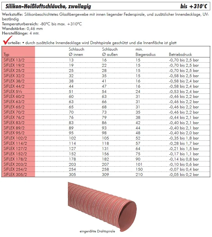 Der Silikon-Heißluftschlauch als Meterware ab 1 m ist zweilagig gefertigt und temperaturbeständig bis +310 °C.