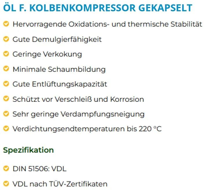 Schützen Sie Ihren gekapselten oder schallgedämmten Kolbenkompressor mit unserem speziell entwickelten Spezialöl. Diese Kompressoren stellen aufgrund ihrer Bauweise besondere Anforderungen an das Schmiermittel. Unser Öl ist darauf ausgelegt, überdurchschnittliche Wartungsintervalle zu ermöglichen und gleichzeitig die Leistung und Zuverlässigkeit Ihrer Anlage sicherzustellen.