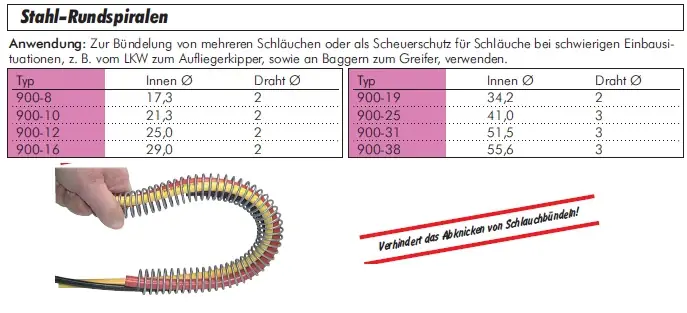 Zur Bündelung von mehreren Schläuchen oder als Scheuerschutz für Schäuche bei schwierigen Einbausituationen, z.B. vom LKW zum Aufliegerkipper, sowie an Baggern zum Greifer, verwenden.