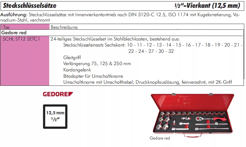 Der Steckschlüsselsatz mit 1/2" Antrieb von Gedore Red® ist ein hochwertiges Profi-Werkzeugset für präzises Anziehen und Lösen von Schrauben und Muttern. Die Sets enthalten verschiedene Steckschlüsseleinsätze und sind ideal kombinierbar mit Ratschen, Knarren, Drehmomentwerkzeugen und Verlängerungen.