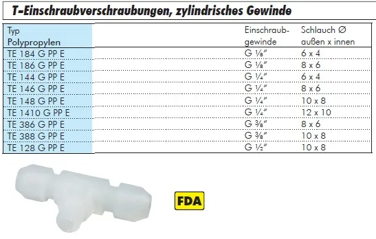 • geeignet für den Einsatz mit Schläuchen aus PA, PUR, PE, PTFE und PFA