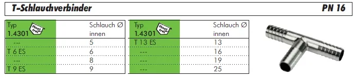 T-Schlauchverbinder aus dem robusten Edelstahl 1.4301 (AISI 304) sind essenzielle Komponenten für die sichere Abzweigung flexibler Schlauchleitungen in hygienisch sensiblen oder korrosiven Umgebungen. Sie bieten eine zuverlässige T-förmige Schnittstelle in der Lebensmitteltechnik, im Sanitärwesen, in Laboren oder in industriellen Bereichen, in denen eine Grundkorrosionsbeständigkeit gefordert ist. Die gerippten Enden (Tüllen) sorgen für einen sicheren Halt des Schlauches an allen drei Abgängen.
