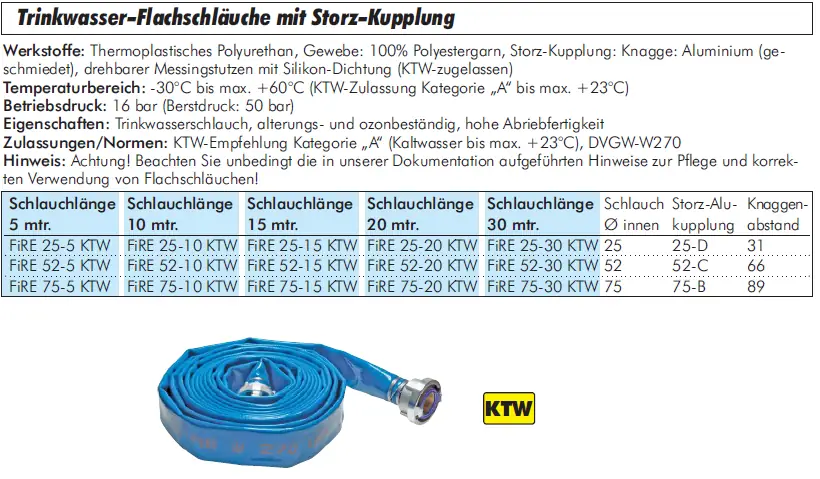 Das Trinkwasser-Flachschlauch-SET mit Storz-Kupplung ist ideal für hygienische Anwendungen in Industrie, Handwerk und Versorgungsbetrieben. Die Schläuche sind lebensmittelecht, flexibel und langlebig.