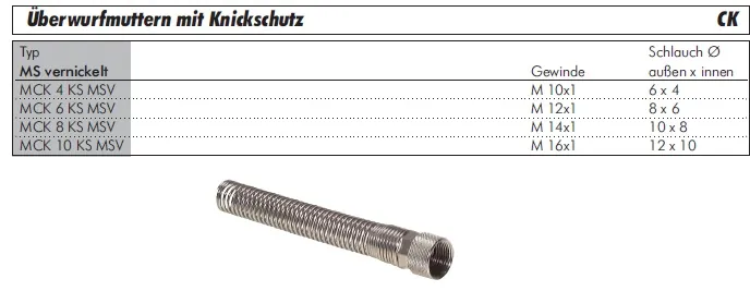 Diese CK-Überwurfmutter aus vernickeltem Messing ist eine Systemkomponente, die speziell für Anwendungen mit hoher dynamischer Belastung der Schlauchleitung entwickelt wurde. Die integrierte, robuste Edelstahl-Knickschutzfeder minimiert die Biegeradien des Schlauchs am Übergang zur Verschraubung und verhindert so effektiv Schlauchbrüche und Undichtigkeiten. Diese Komponente wird auf den separaten Grundkörper der CK-Verschraubung aufgeschraubt. Die Lieferung erfolgt als Einzelteil ohne den notwendigen Schneidring (Klemmring), welcher separat erworben werden muss.