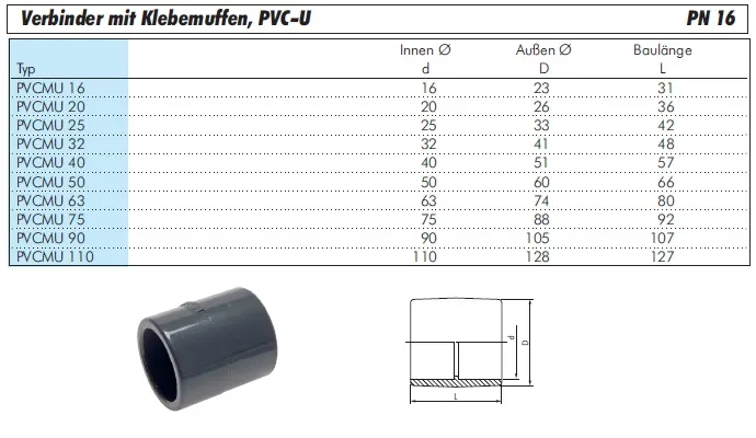 Unsere Verbinder mit Klebemuffen aus hochwertigem PVC-U (Polyvinylchlorid, weichmacherfrei) sind die bewährte und langlebige Lösung für die sichere Verbindung Ihrer Druckrohrleitungen. Diese Fittings sind für einen Nenndruck von PN 16 (16 bar) ausgelegt und garantieren eine absolute Dichtigkeit im Kaltwasserbereich.