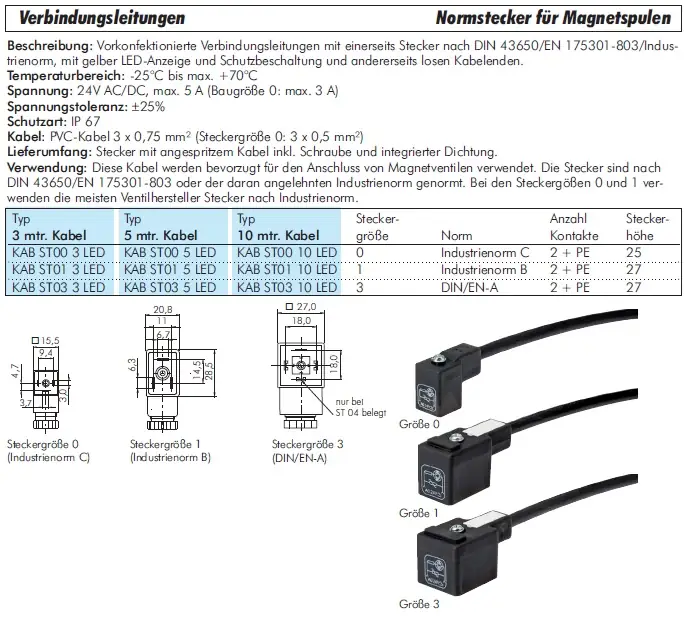 Diese Kabel werden bevorzugt für den Anschluss von Magnetventilen verwendet. Die Stecker sind nach DIN 43650 / EN 175301-803 oder der daran angelehnten Industrienorm genormt. Bei den Steckergrößen 0 und 1 verwenden die meisten Ventilhersteller Stecker nach Industrienorm.