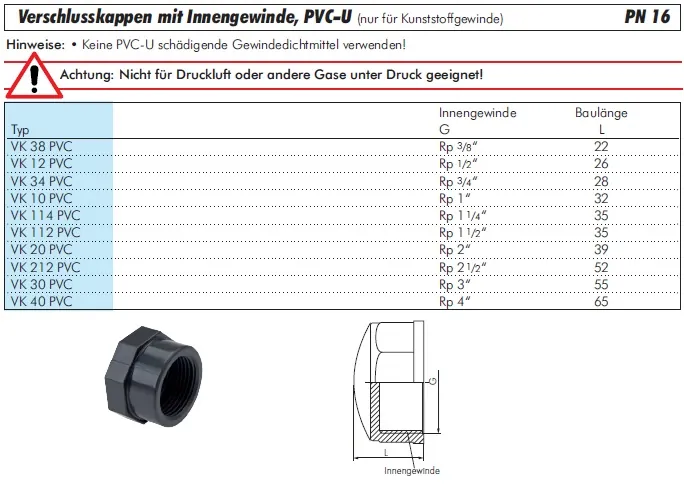 Unsere Verschlusskappen mit Innengewinde aus hochwertigem PVC-U (Polyvinylchlorid, weichmacherfrei) sind die zuverlässige Lösung zum sicheren und lösbaren Verschließen von Außengewinden in Ihrem Druckrohrsystem. Diese Fittings sind für einen Nenndruck von PN 16 (16 bar) ausgelegt und garantieren eine absolute Dichtigkeit im Kaltwasserbereich.