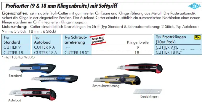Eigenschaften: sehr stabile Profi-Cutter mit gummierter Griffzone und Klingenführung aus Metall. Die Rasterautomatik sichert die Klinge in der eingestellten Position. Der Autoload-Cutter erlaubt zusätzlich ein automatisches Nachladen einer neuen Klinge aus dem im Griff integrierten Klingenmagazin.