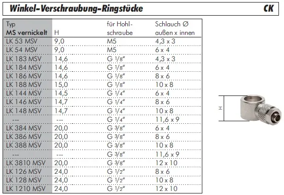 Dieses Winkel-Verschraubung-Ringstück aus vernickeltem Messing ist ein Zubehörteil für das CK-Verschraubungssystem und wird in Kombination mit einer separat erhältlichen Hohlschraube verwendet. Die Konstruktion ermöglicht nach der Montage eine 360° freie Drehbarkeit des Schlauchabganges, was eine flexible Installation und Ausrichtung der Leitungen in komplexen Anlagen oder bei beweglichen Maschinenteilen gewährleistet. Die Abdichtung zur Hohlschraube erfolgt über einen internen O-Ring.